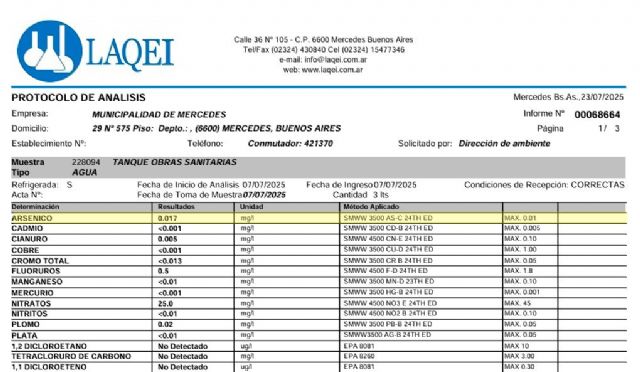 La discusión sobre la calidad del agua en Mercedes volvió a cobrar fuerza cuando trascendió el informe oficial que la Municipalidad utiliza para justificar la potabilidad del servicio. El análisis, realizado por el laboratorio LAQEI, muestra que la muestra del tanque de Obras Sanitarias arrojó un valor de 0,017 mg/l de arsénico. Lo más relevante no es solo la cifra, sino la anotación que aparece junto a ella: el laboratorio fija un “máximo permitido” de 0,01 mg/l. Es decir, según el propio documento que el municipio ofrece como respaldo técnico, el agua distribuida en la ciudad supera el límite legal vigente.