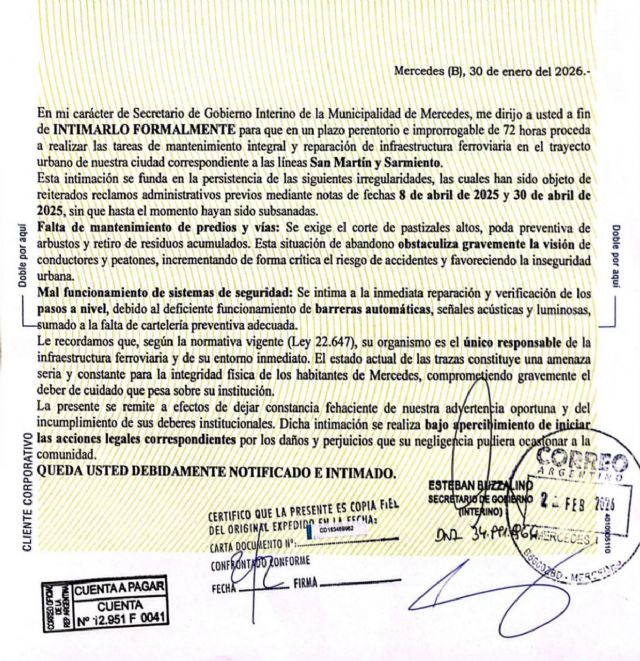 Luego del planteo público del concejal Mauricio Pollacchi para que se refuercen los controles en los pasos a nivel, el Municipio volvió a elevar un reclamo formal por el estado de la infraestructura ferroviaria en el trayecto urbano de Mercedes. Según comunicó la comuna, durante la jornada de este lunes se remitió una carta a Trenes Argentinos para reiterar pedidos que, aseguran, vienen realizando en distintas oportunidades ante lo que describen como un deterioro sostenido y falta de respuestas.