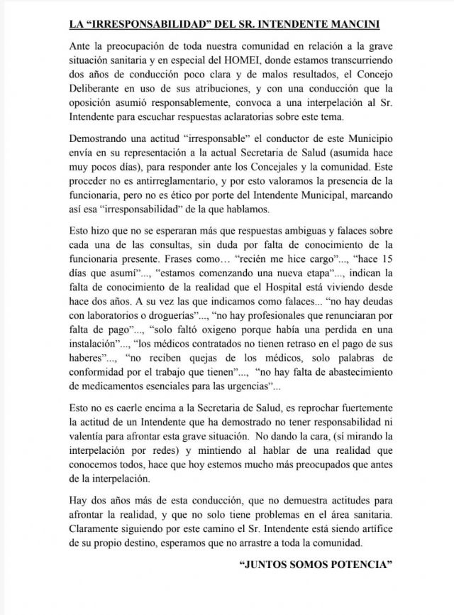 Según se detalla en el documento, el Concejo Deliberante resolvió convocar al intendente a una interpelación formal para que brindara explicaciones ante la creciente preocupación de la comunidad. Sin embargo, lejos de presentarse personalmente, Mancini envió en su representación a la secretaria de Salud, quien había asumido el cargo apenas días antes. Para la oposición, si bien la presencia de la funcionaria no vulneró normas reglamentarias, sí constituyó un gesto político inaceptable, interpretado como una falta de compromiso y de responsabilidad institucional.