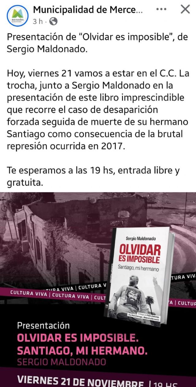 La Municipalidad de Mercedes difundió y auspicia la presentación del libro “Olvidar es imposible”, escrito por Sergio Maldonado, hermano de Santiago. La actividad tendrá lugar en el Centro Cultural La Trocha y se anuncia como un recorrido por la desaparición y muerte del joven ocurrida en 2017, enmarcada allí como consecuencia directa de una represión estatal.
