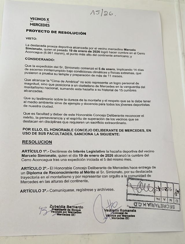 El expediente 15/26 fue presentado por los concejales Bernardo Zubeldía y Romanela Vautretto, del espacio Vecinos por Mercedes. En el texto sostienen que la llegada de Simionato a la cima, el 19 de enero de 2026, no fue un golpe de suerte ni un hecho aislado, sino la consecuencia de un proceso sostenido de preparación y de una expedición exigente en condiciones adversas.